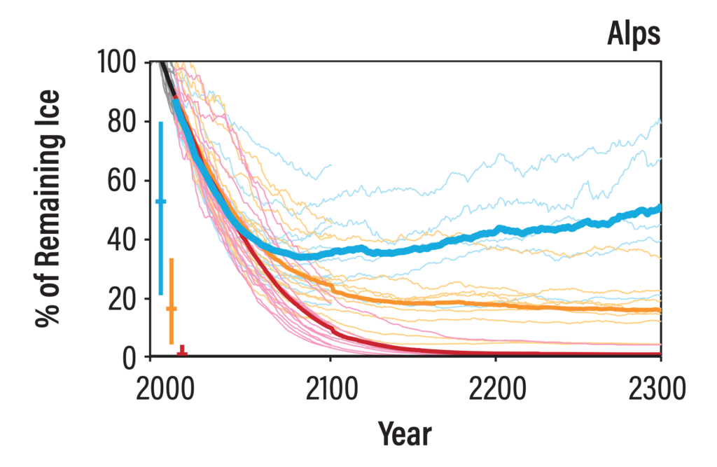 That is one finding of the 2021 State of the Cryosphere report. It incorporates two enormous “ifs” and is buried on page 17 along with much bleaker forecasts for higher emissions scenarios and lower latitudes (glaciers closer to the equator). But an accompanying graph shows unmistakably that alpine glaciers will start regrowing around 2090 in a world aligned to 1.5 degrees of warming or even a little more.