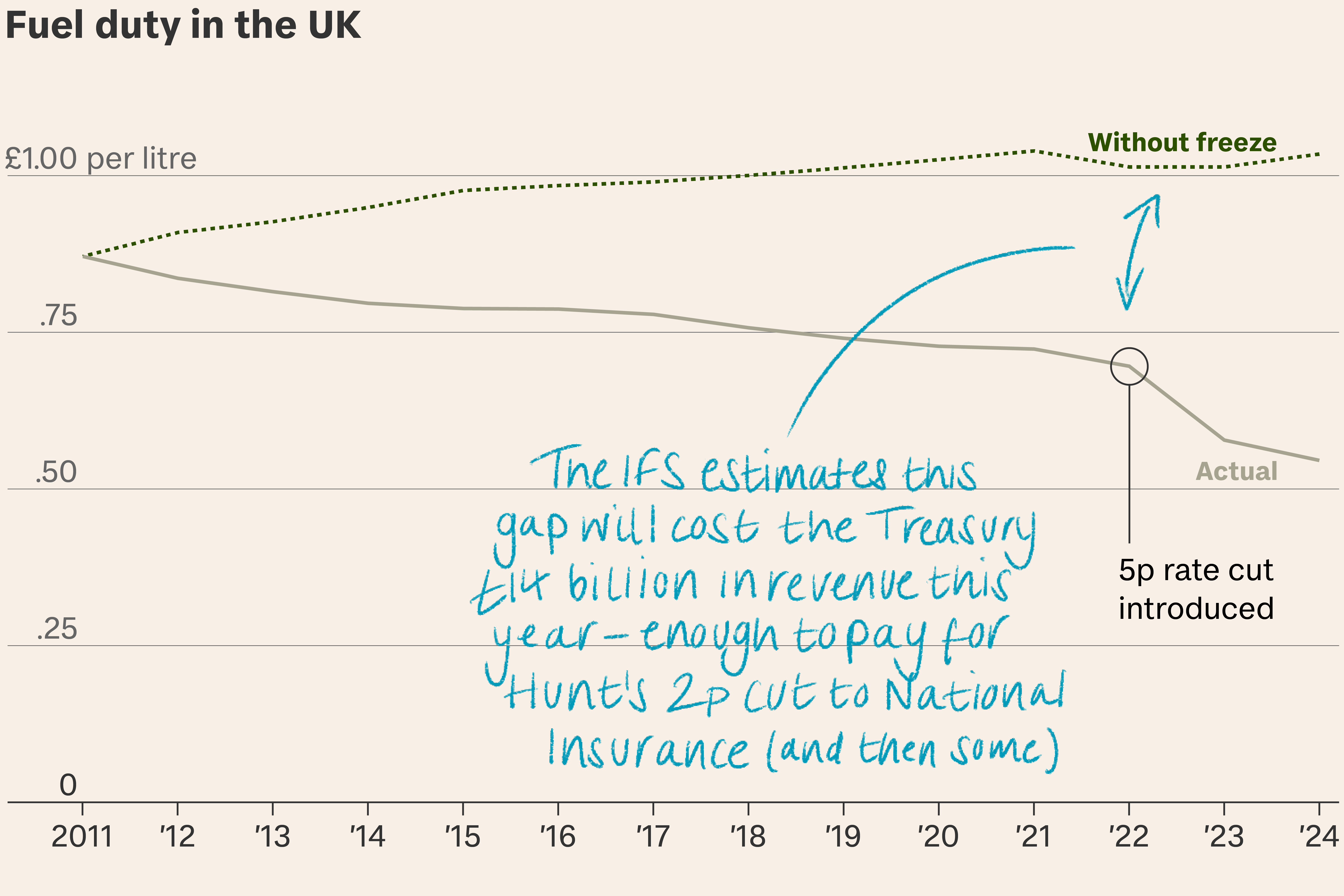 Revenues from fuel duty are around £14 billion lower in 2023-24 than if they had increased in line with inflation since 2010-11. Fulfilling the desires of Tories who called for a 2p cut to income tax would have cost the same amount.