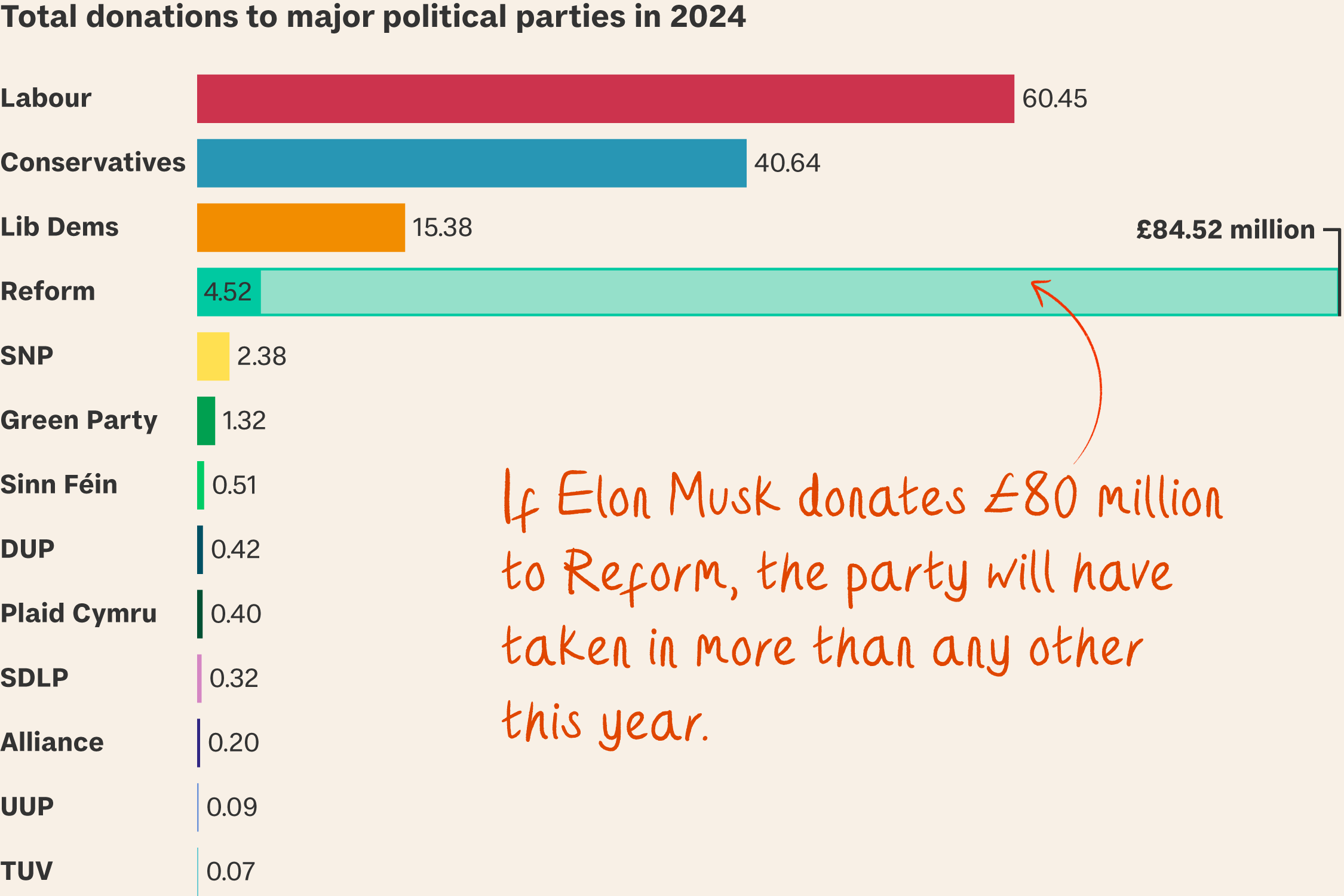 If Musk gave even a quarter of the rumoured £80 million sum, he would change the fortunes of the party – and the likely direction of the country – forever. And as things stand, there is nothing stopping the world’s richest person giving as much as he likes.